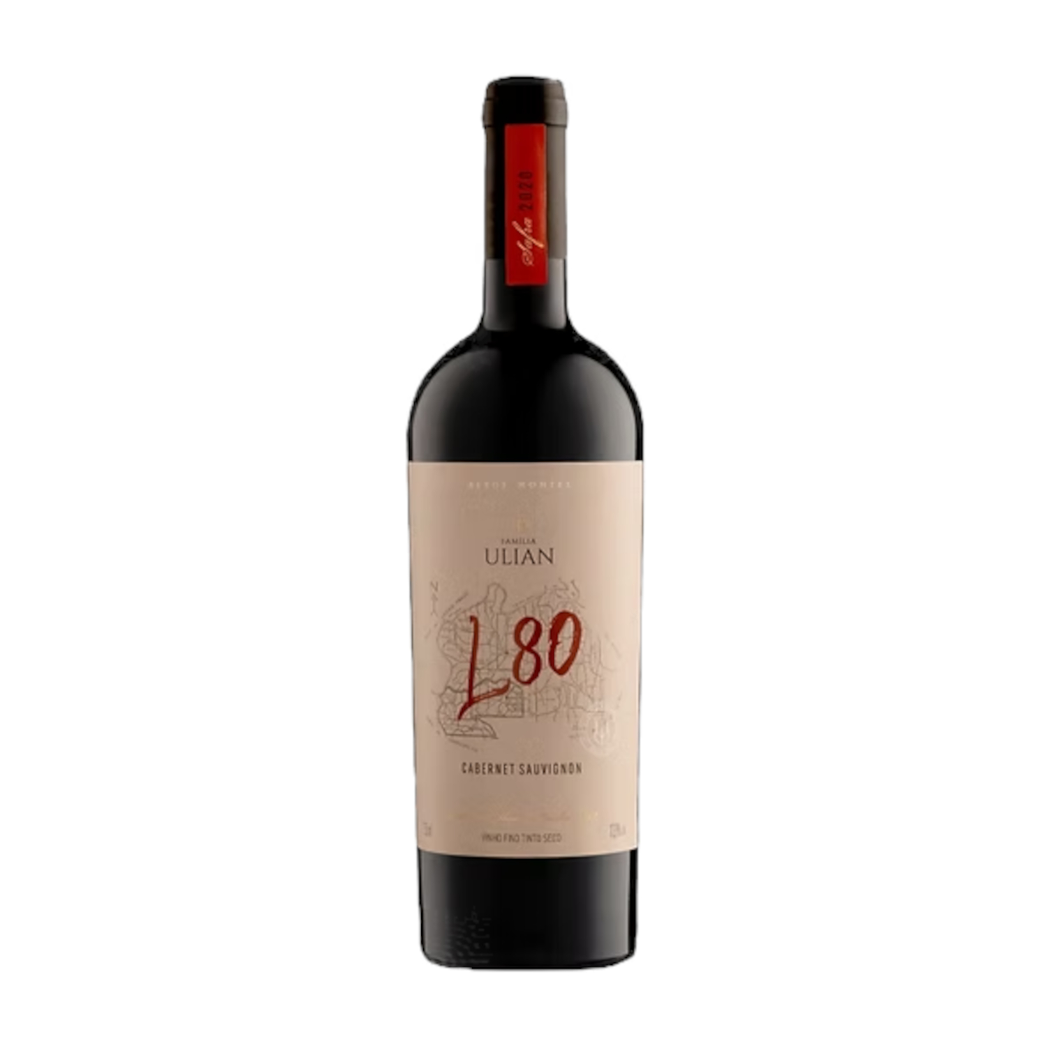 Este vinho tinto L Oitenta da Ulian é composto 100% por uvas Cabernet Sauvignon da Serra Gaúcha. Maturou por 6 meses em barricas de carvalho francês e americano de primeiro e segundo uso. Após, 36 meses de repouso em cave subterrânea. Trata-se de um vinho encorpado, robusto, persistente e marcante.